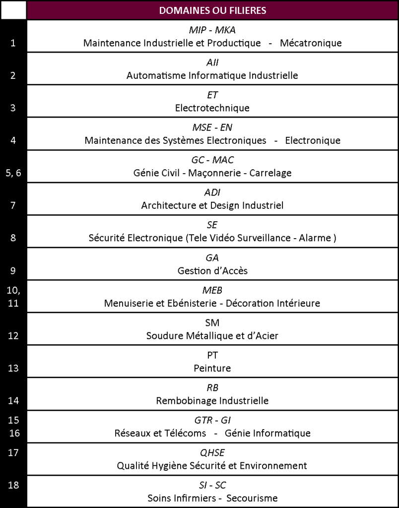 Liste des 18 Filières Intervenant dans le Domaine des Ascenseurs